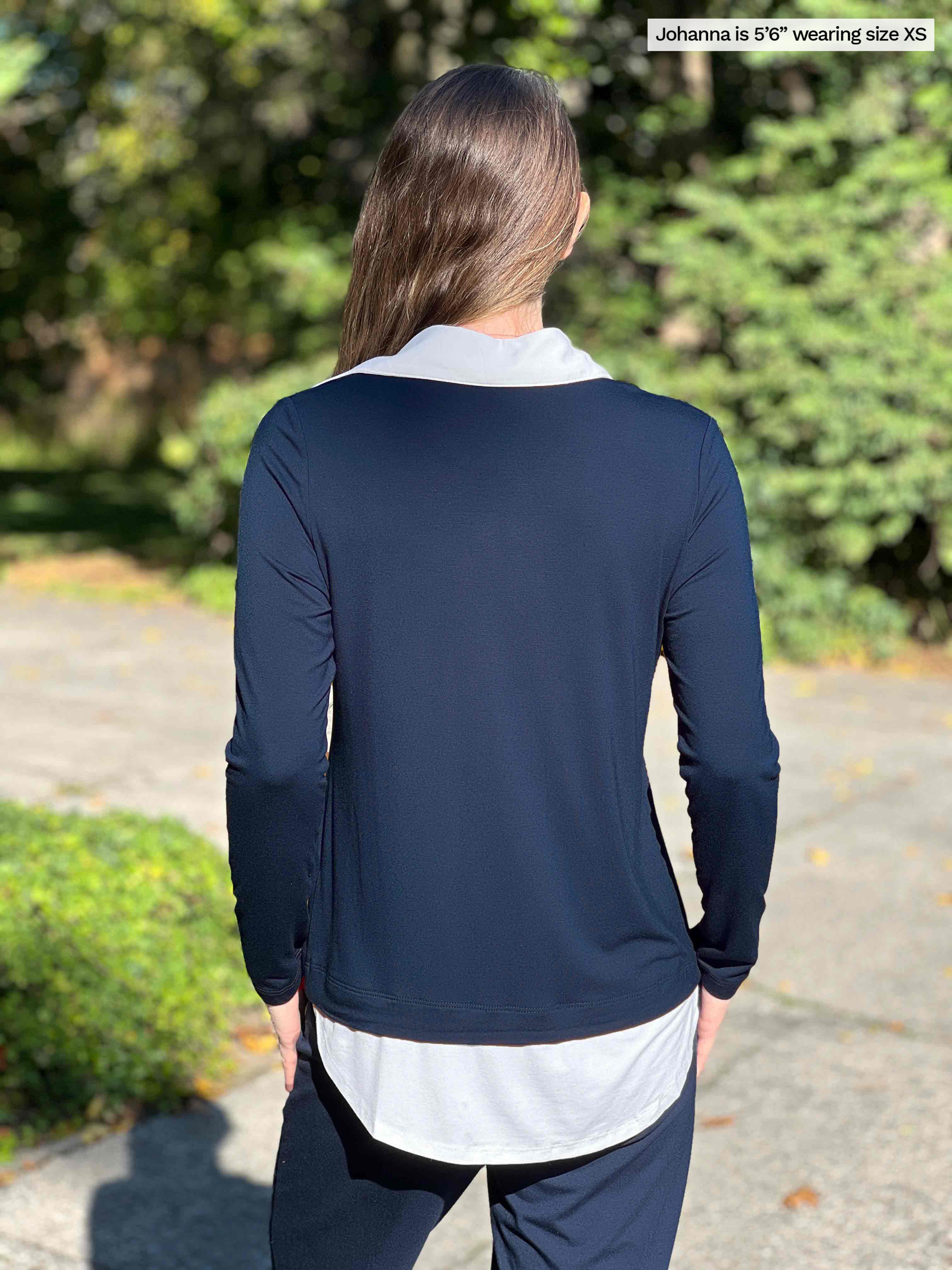 The Carson gives the look of a v-neck top worn over a crisp, white traditional collared shirt – but without the added bulk! Designed with the perfect amount of white shirttail showing at the hem, this faux-layer top is super soft and stretchy. No fuss, no ironing, no dry cleaning. Style the Carson with jeans for the weekend or our Reed pants for a put together, yet comfy office look.