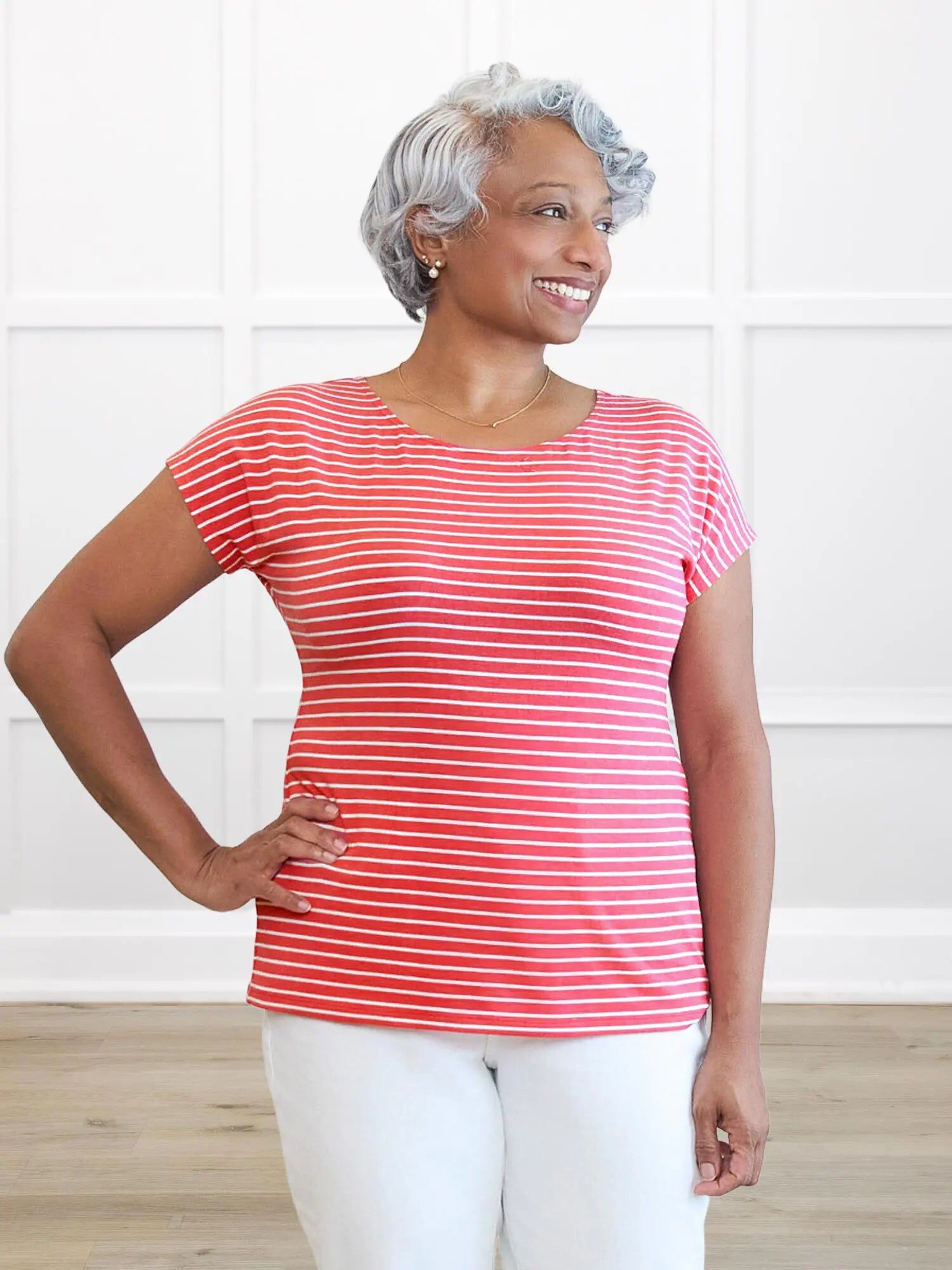 The Mimi top is flattering for every body type. It’s back-to-front reversible, giving you two looks in one—effortlessly switch from a boatneck to a scoop neck! This year-round versatile top looks great on its own or layered under cardigans and blazers.