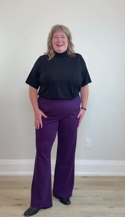 Woman wearing a black turtleneck and purple pants against a white wall.