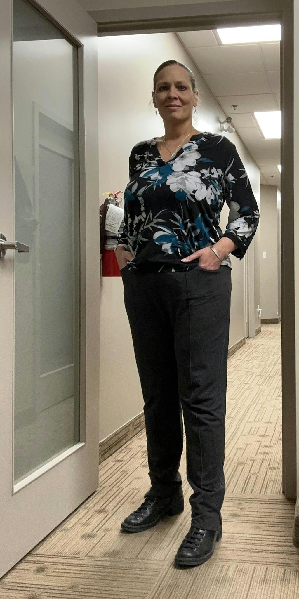 Woman wearing a white long-sleeve top and dark pants standing against a white wall